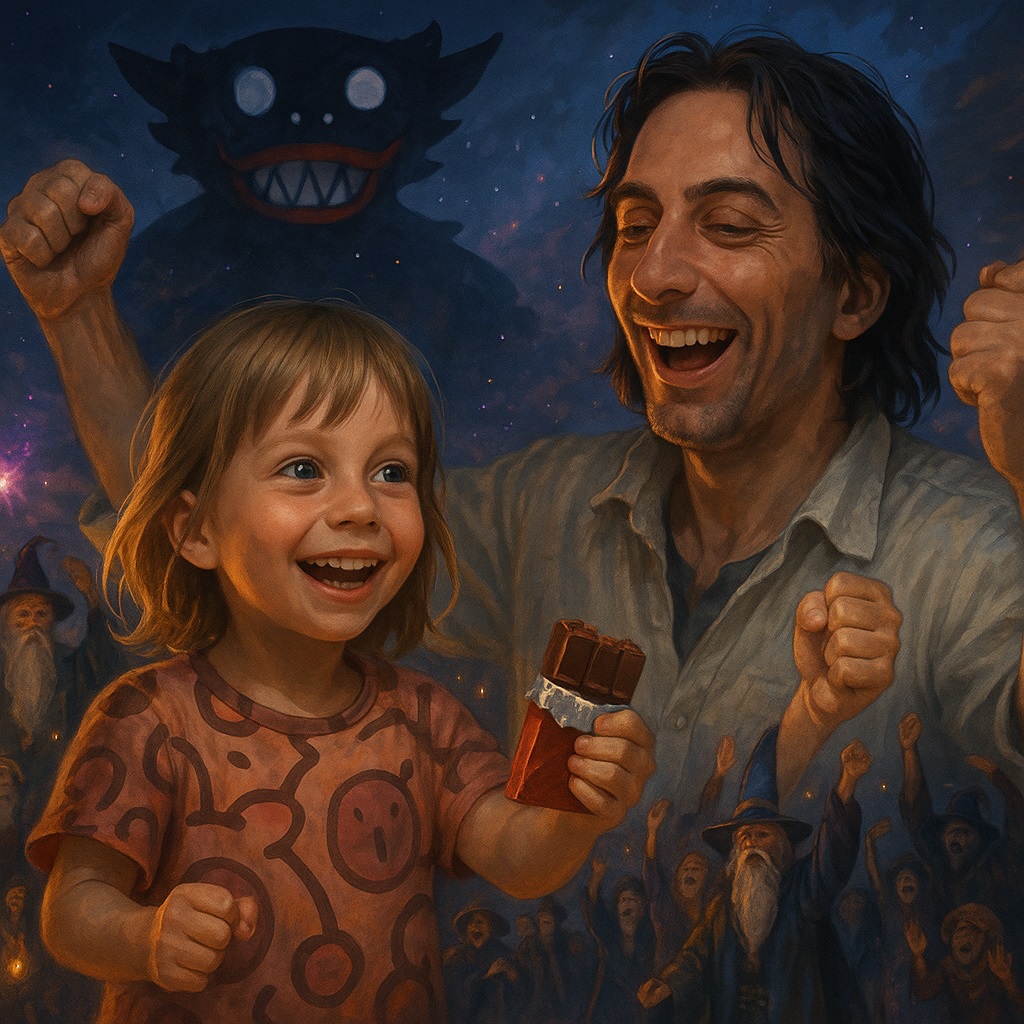 A történetmesélést ekkor befejezve, idekint, a valóságban Apuhoz is odaszaladt, és hozott neki egy fehér csokoládét tartalmazó, becsomagolt csokitojást.