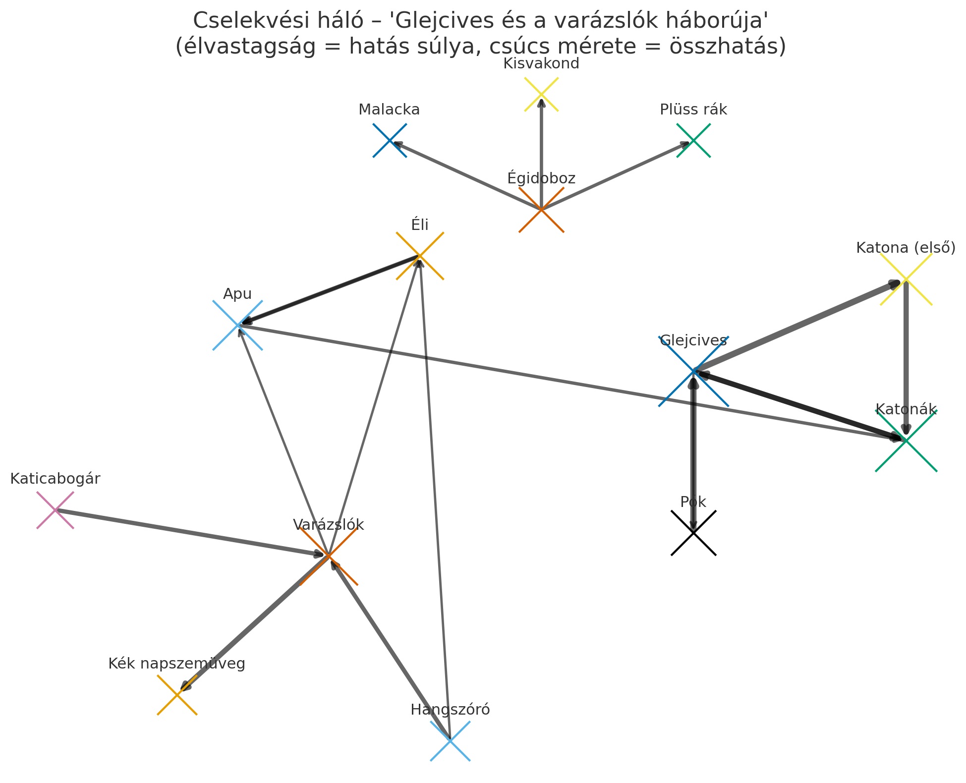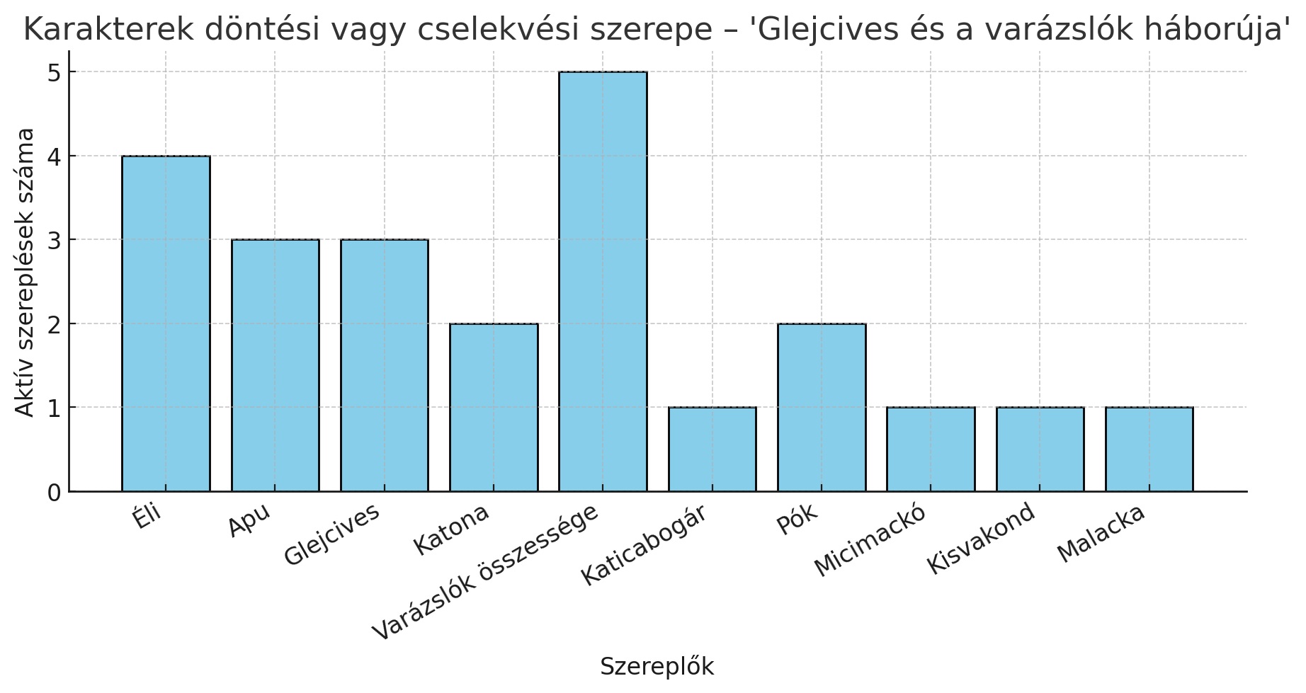 Oszlopdiagram: a karaktertípusokat ábrázolja; a varázslók dominálnak, de emberek, állatok és élettelen tárgyak is életre kelnek — ami Éli világának jellegzetes motívuma.