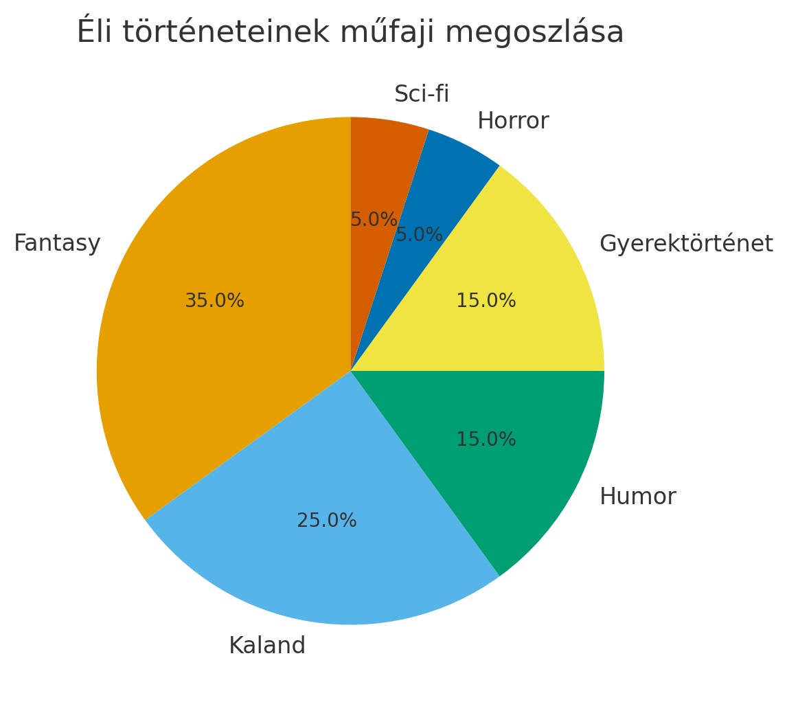 Kördiagram: megmutatja, hogy Éli meséi milyen műfajokból állnak össze — leginkább fantasy (35%) és kaland (25%), de erősen jelen van a humor és a gyerektörténet jellege is.