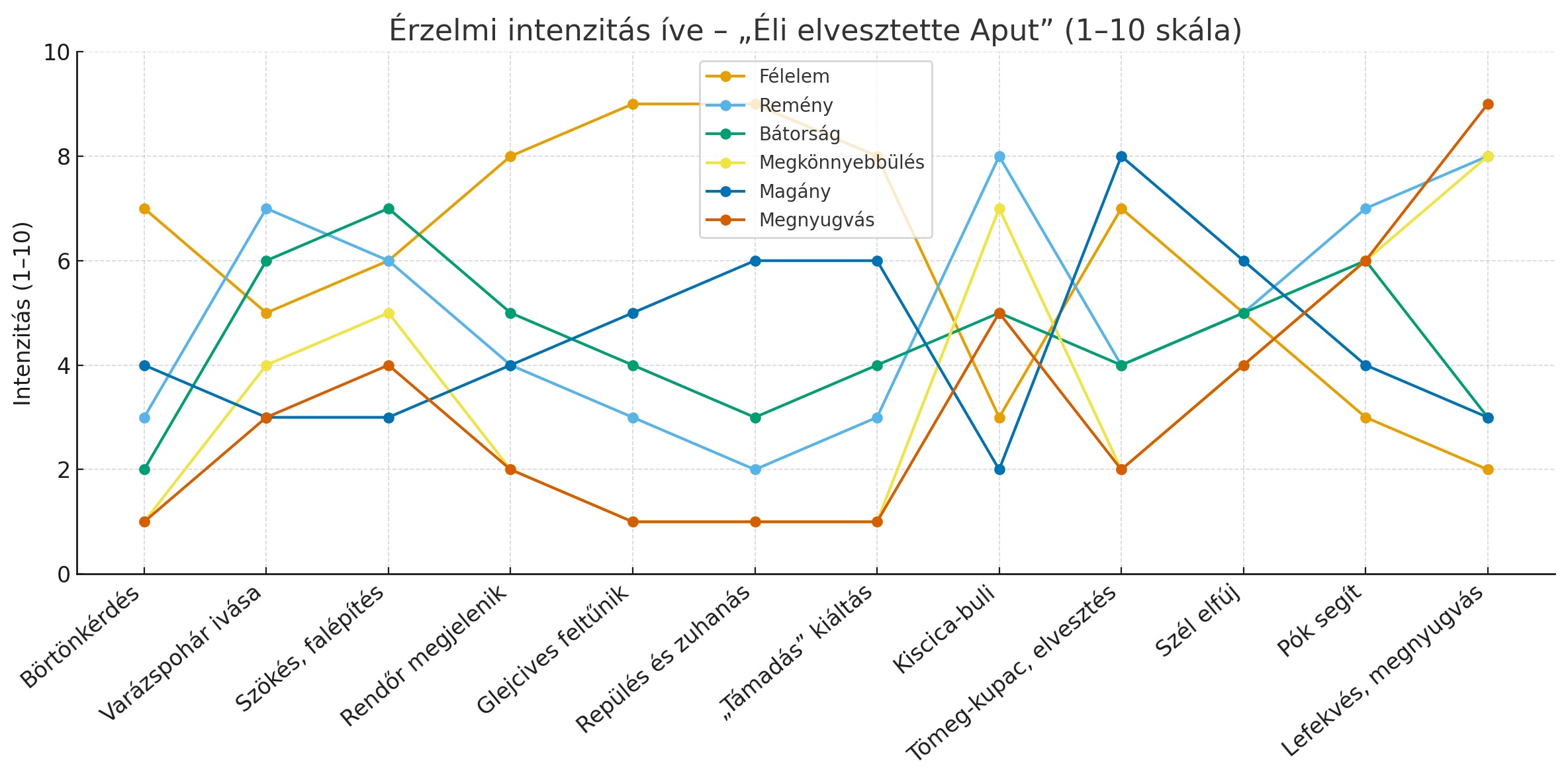 Érzelem-validáció pillanatai: amikor Éli mesél (vagy játszik), mindig nevezd meg az érzést: „Látom, nagyon félsz, hogy elveszíted apát” — ezt mondd el hitelesen, röviden. Nem kell azonnal megoldani, csak érvényt adni az érzésnek. Ez hatalmas hatású.