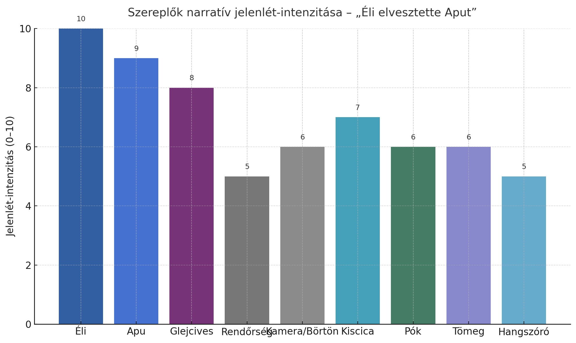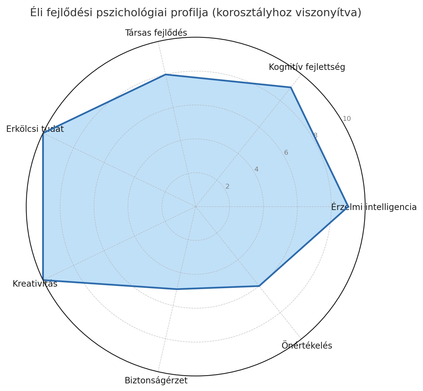 Ez a radar- (vagy pókháló-) diagram Éli teljes fejlődési pszichológiai profilját ábrázolja, a korosztályos átlaghoz viszonyítva (0–10 skálán).